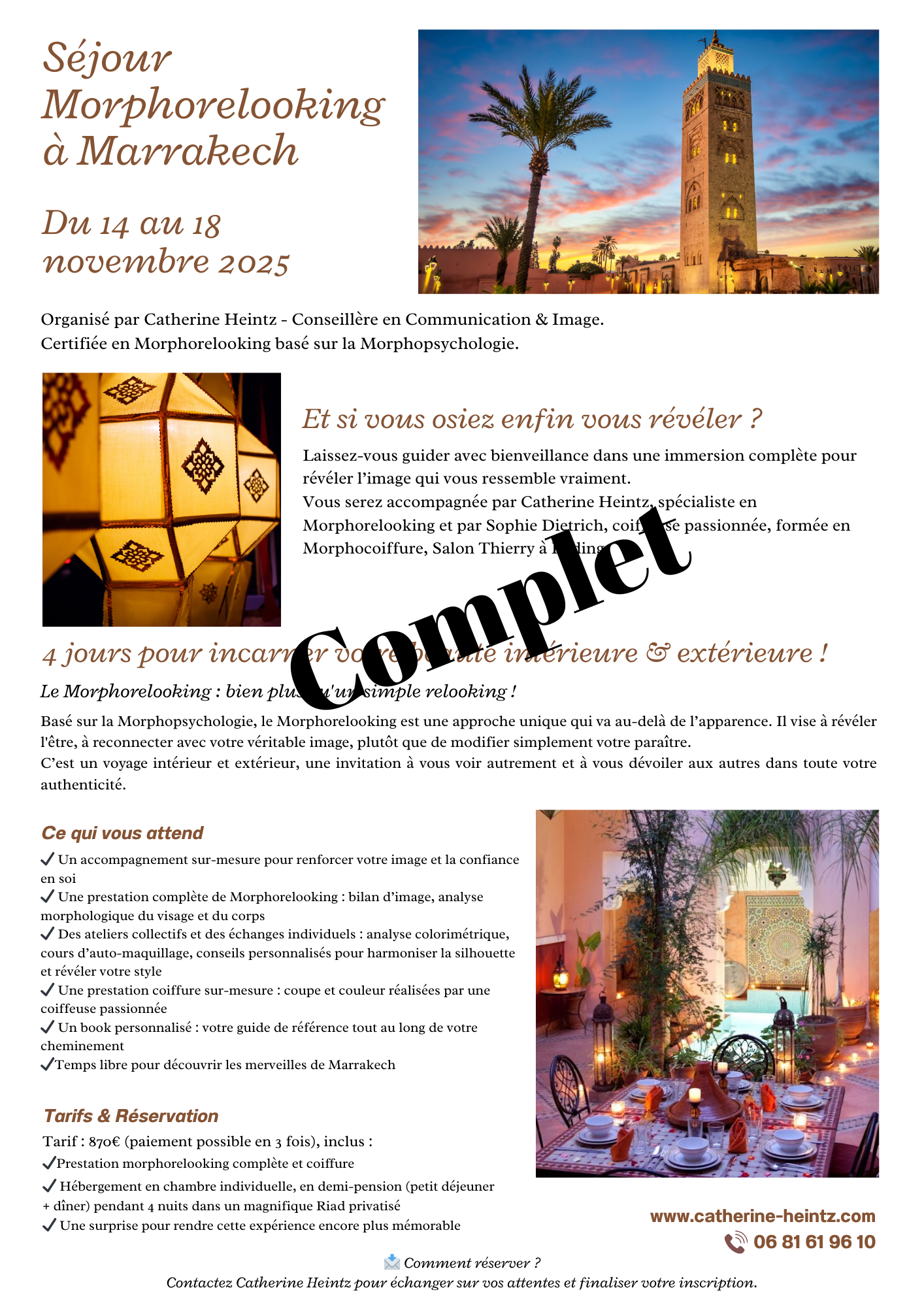 Marrakech MarrakechAprès le succès de la première édition, le Séjour MorphoRelooking à Marrakech revient du 14 au 18 novembre 2025 pour une nouvelle immersion au cœur de vous-même. Pendant 4 jours, dans l’ambiance envoûtante d’un riad marocain, offrez-vous une parenthèse hors du temps pour vous reconnecter à votre image, votre énergie, votre authenticité.Accompagnée avec bienveillance, vous […]